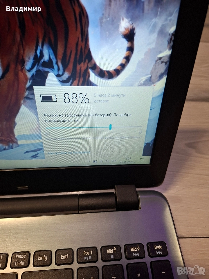 Лаптопа работи безпроблем,почистен и преинсталиран с нова термопаста,батерията държи над 3часа,има си и зарядно