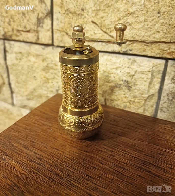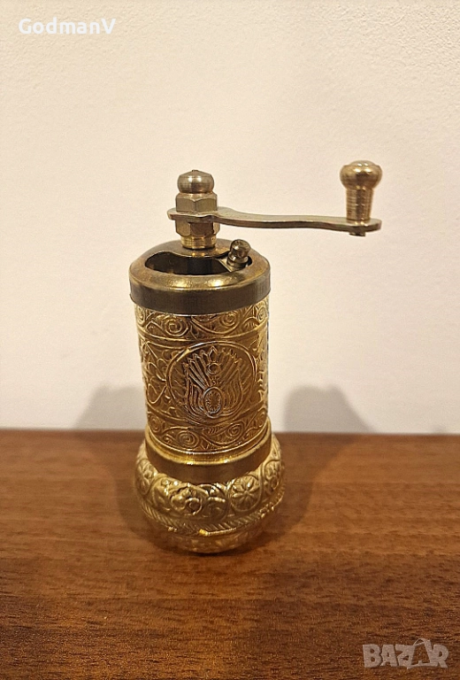 Продавам Ръчна мелничка с класически винтидж дизайн и богата орнаментика. Подходяща за смилане на черен пипер, подправки или като стилен акцент за кухня, трапезария или заведение. Компактна, удобна за употреба и с автентично усещане.