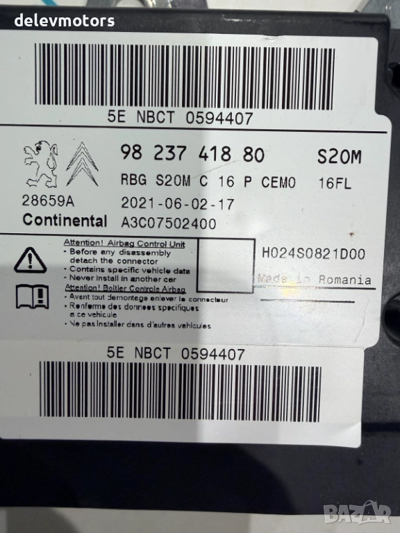 9823741880 airbag модул от Citroen C5 Aircross 1.6 PureTech 181кс., двигател 5GF (EP6FADTXD), 8 ск. автоматична кутия, 22 000 км., 2022 г., euro 6D, Ситроен Ц5 Аиркрос 1.6i, 181 hp., engine 5GF (EP6FADTXD), 8 sp. Auto gear box в автоморга Delev Motors, между с. Каменар и с. Куманово гр. Варна.