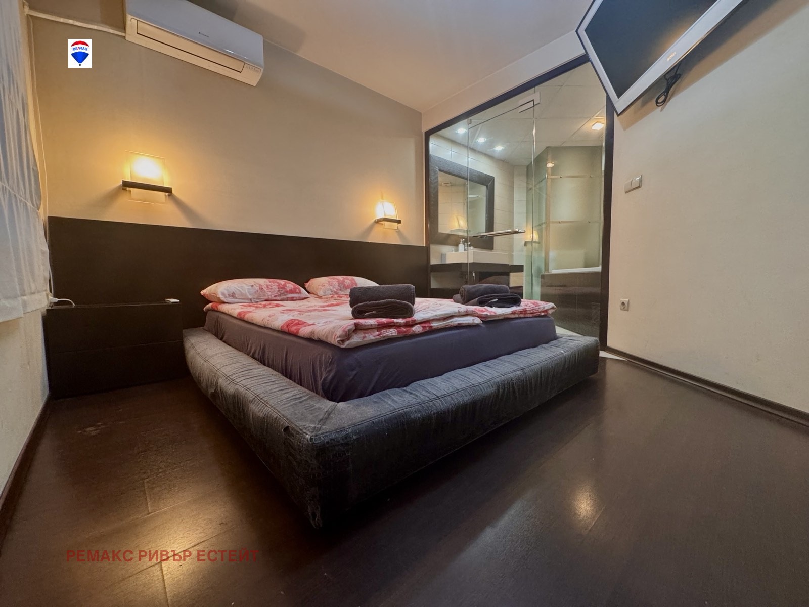 - Самостоятелна спалня, обзаведена с голямо легло, гардероб и нощни шкафчета, осигуряваща спокойна и уютна среда за отдих, с директна връзка към банята с хидромасажна вана.