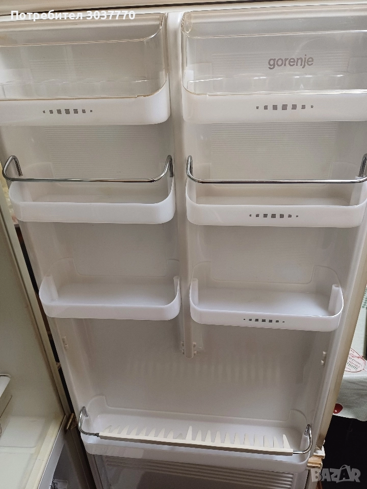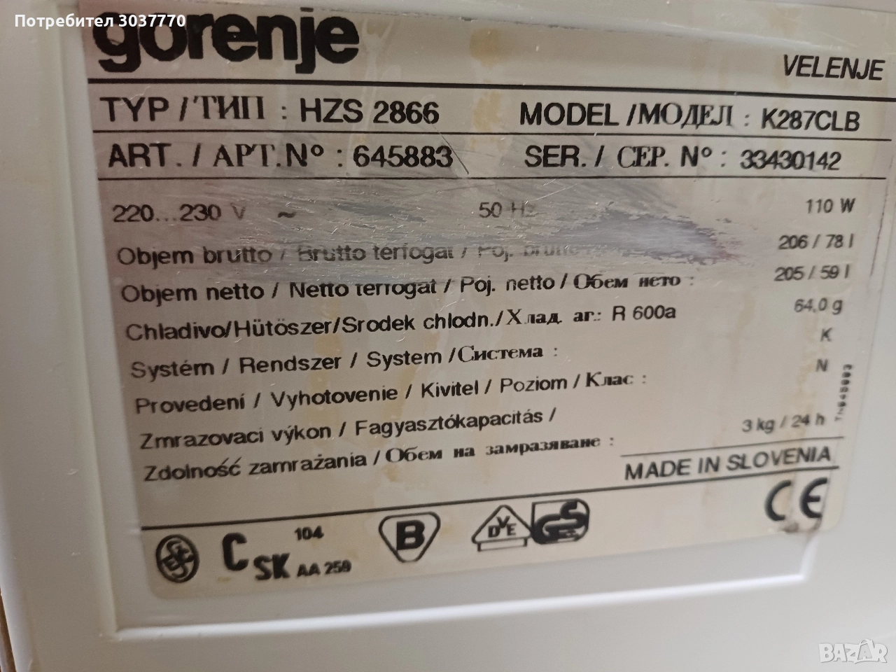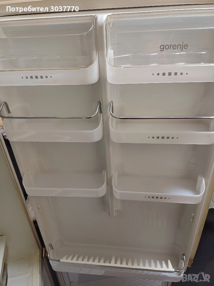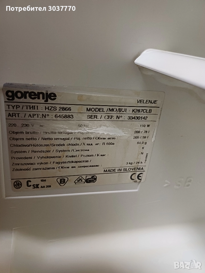 Хладилник с фризер-gorenje,работил е безотказно, почистен,готов за употреба!На снимките ще видите табелката с данните му за обем на фризера и хладилната част,както и класа.Чекмеджетата са с леко липсваща част на пластмасата,а фризерните чекмеджета са направени с мрежа.Хладилника-фризер притежава функция за бързо замразяване и се намира в гр.София.При евентуално договаряне е възможно да се вземе в почивен ден.За повече информация-обадете се.