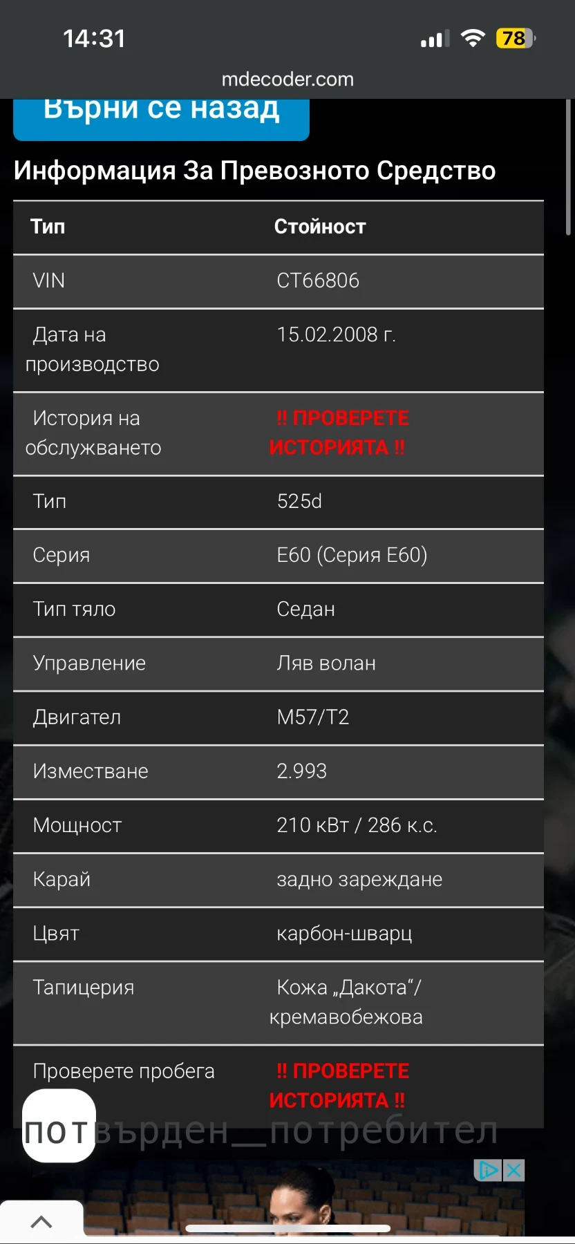 В отлично състояние, визуално и технически, нов внос от Холандия, докарана на собствен ход, реален пробег, фейслифт М57 най-здравия мотор, Carbonschwarz metallic, заводски М пакет, спортно окачване Bilstein, М аеродинамичен пакет, Stage 2 на мотор и кутия, спортна генерация, само на задно, М джанти 18 с нови гуми Continental Sport, 2 ключа, голямата навигация, къпхолдъри, М мултифукционален волан, кожено рекаро Dakota, черен таван, динамик завиващ биксенон, парктроници отпред и отзад с визуализация, автопилот, сензор за дъжд и фарове, система за измиване на фаровете и др. РАМА: WBANX51070CT66806 Предлагаме само избрани автомобили с гарантиран произход и качество. АВТОКЪЩАТА НЕ ПРЕДЛАГА СОБСТВЕН ЛИЗИНГ И НЕ ПРИЕМА БАРТЕРИ! ! ! Възможност за ЛИЗИНГ през няколко компании: (UNICREDIT LEASING (TBI LEASING)- (AMIGO LEASING)