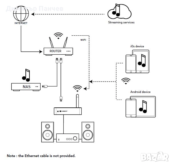 Стриймърът предлага достъп до цифрово аудио съдържание с високо качество от Spotify, Deezer, Tidal, Qobuz, Amazon и пр, с пълно управление от удобно приложение за телефона.