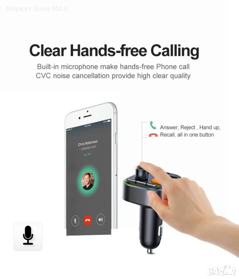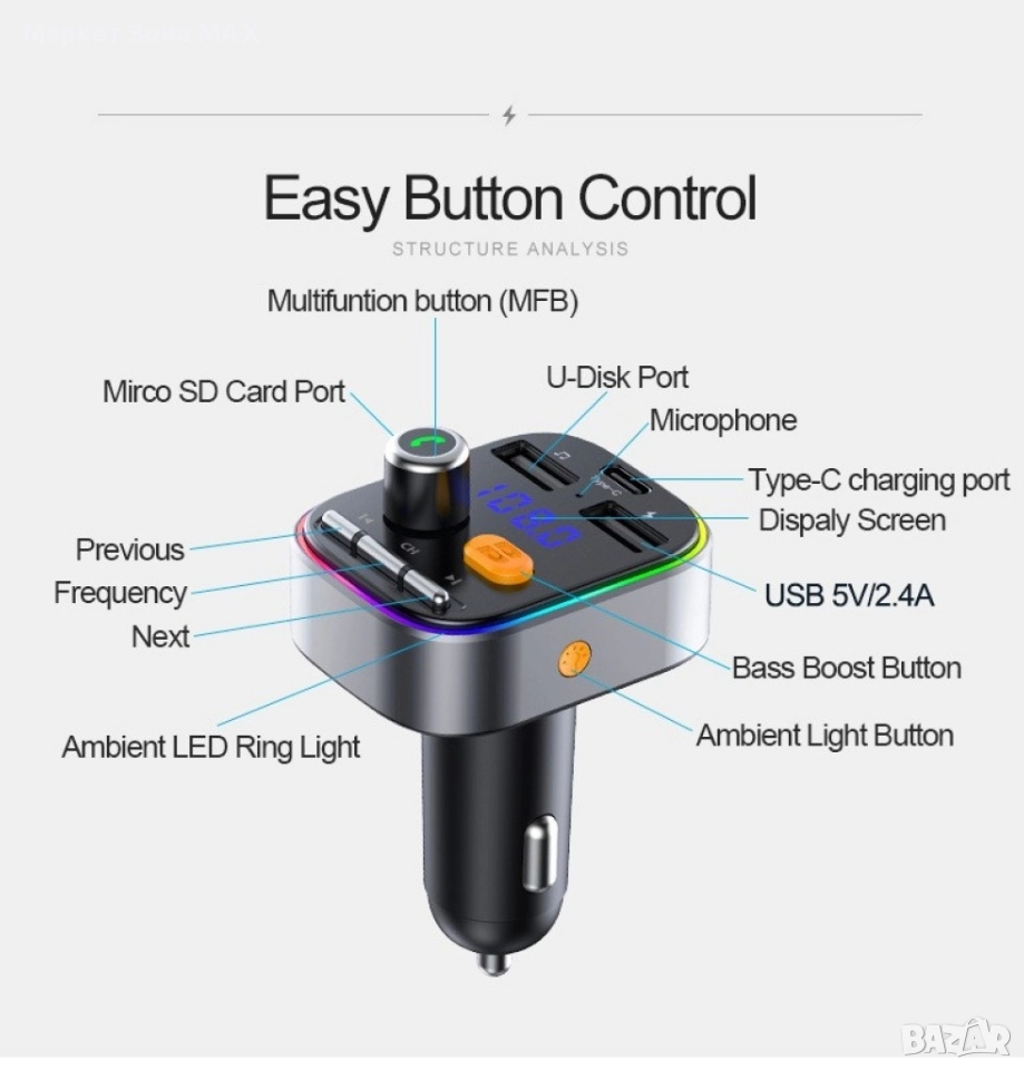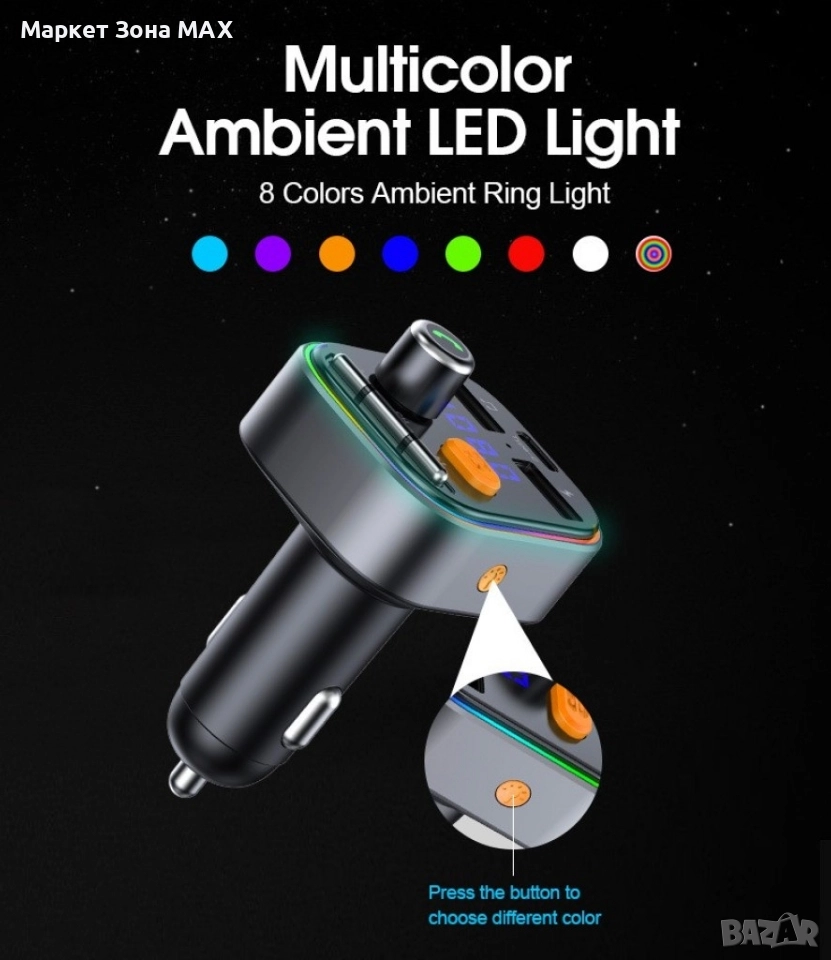 Bluetooth трансмитер за кола с 2 USB и 1 USB type-c - 1 брой;