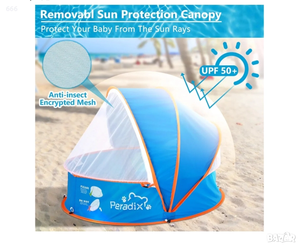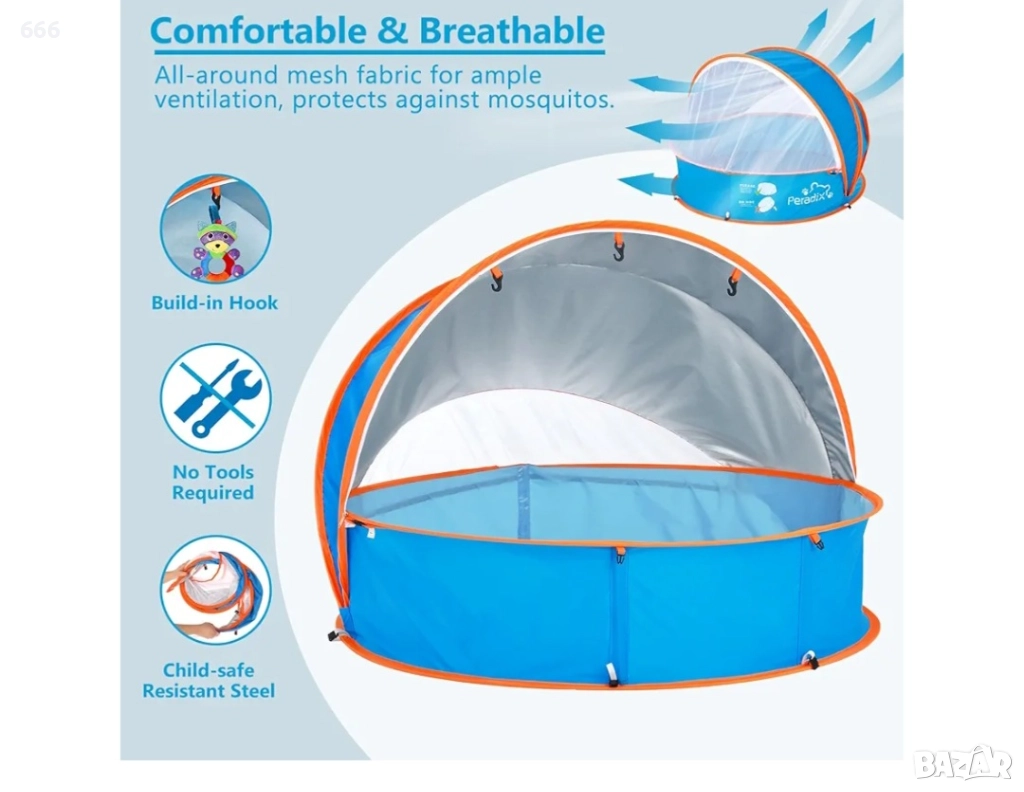 Peradix 4 в 1 бебешки басейн, плажна палатка с UV слънцезащитен навес и мрежа против комари