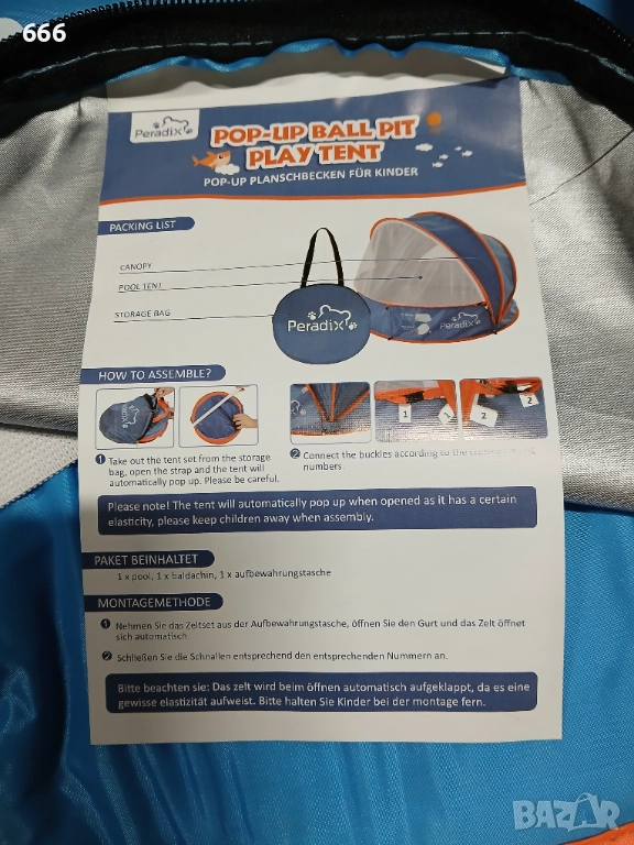 Голям капацитет: размерът на разгънатата палатка за игра е 94 см x 25 см (37 инча x 9,8 инча), което е достатъчно голямо, за да побере две деца (под 5 години). Размери на сенника: 94 см x 68 см (37 инча x 26,7 инча). Играйте с топката у дома, носете я в градината, на плажа или в парка и се насладете на семейните си събирания.