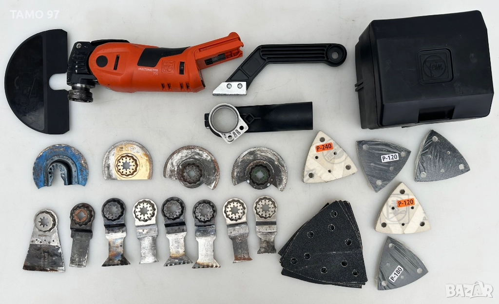 мултишлайф, реноватор) с потенциометър за регулиране на оборотите на Фейн. Машината е в отлично визуално състояние и работи отлично, без никакви проблеми. Оригинално немско производство внос от Франция. Комплекта включва машината, аксеоари за прецизна работа, консумативи и оригинален куфар! БЕЗ БАТЕРИИ И ЗАРЯДНО! Пращаме с опция преглед и тест с куриерска фирма еконт може и лично предаване за гр. Шумен. Магазинската цена е: 355.35евро