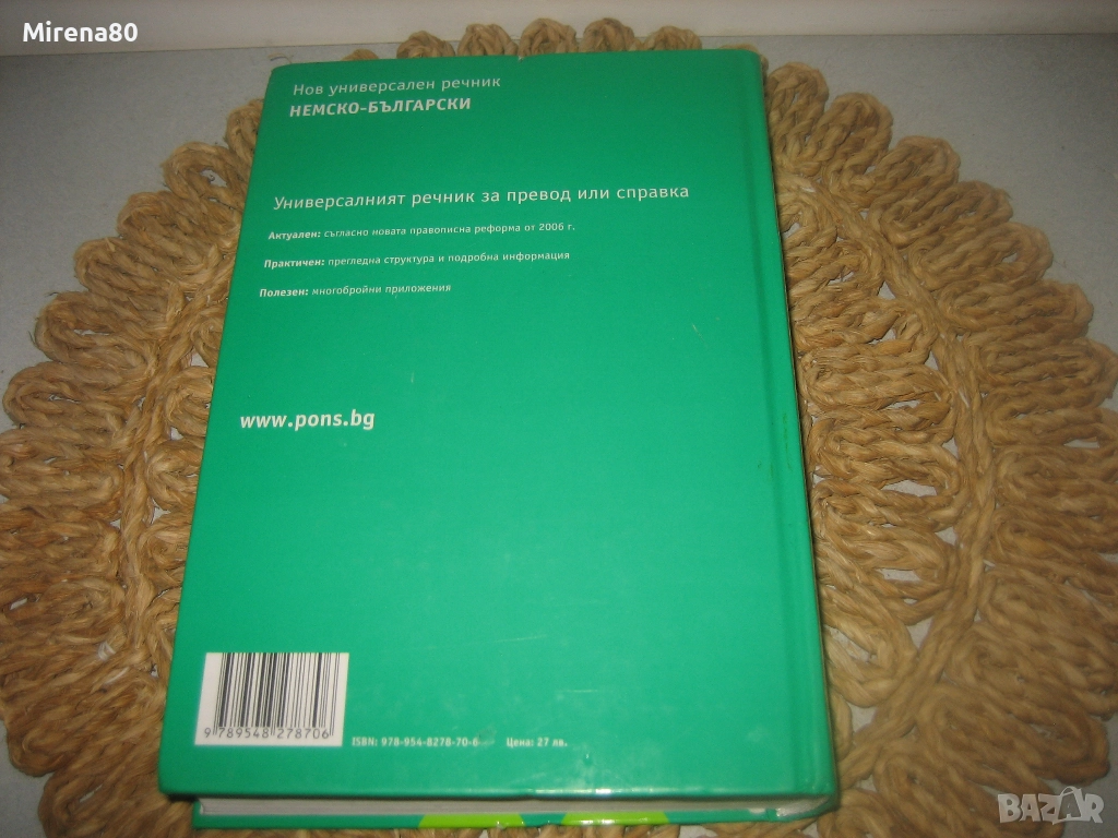 Страхотен речник ! Изд. Понс, 2006 г. Съставители: Колектив. Твърди корици, 1118 стр. Съдържа над 102 000 думи от съвременния писмен и говорим немски език. Речникът е идеален както и за обикновена справка, така и за професионални преводи. С прегледна подредба, подробна информация за отделните значения на