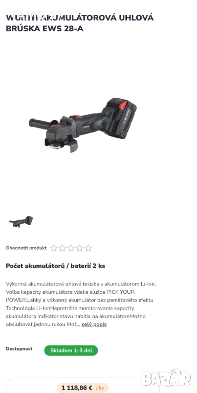 Продавам мощен акумулаторен ъглошлайф на Вюрт. Машината е в перфектно визуално състояние, както се вижда на снимките използван е малко и работи перфектно, оригинално немско производство от 2022г. внос от Франция. Обявената цена е за комплекта от машина с 2 батерии по 28V 3.0Ah с индикатор, бързо зарядно и оригинален куфар. Пращаме с опция преглед и тест с куриерска фирма еконт може и лично предаване за гр. Шумен. Магазинската цена е: 1 118евро