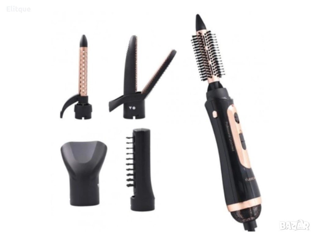 Тип продукт: Hair Air Styler 6 в 1; Захранващо напрежение: 220-240v 50-60 Hz; Мощност: 1000 W; DC двигател; Превключете настройка 0-1-2; Лед индикатор; Безопасно изключване; Функция за студено и горещо; Приставка: Голяма ролкова четка, маша, получетка, патешка човка, вълнообразна дюза; Въртящ се кабел на 360 ֯; VDE щепсел; Цвят: Черен с розово злато. 2г. гаранция
