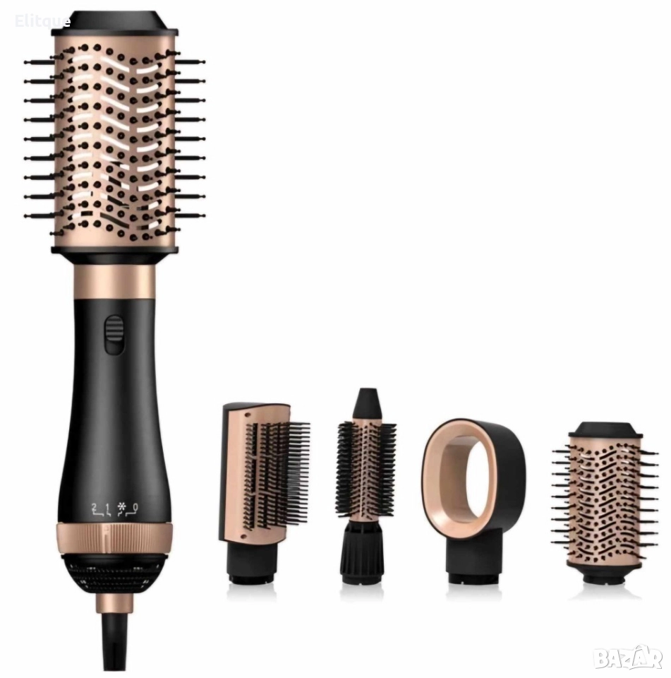 Тип продукт: Сешоар Styler 4 в 1 Мощност: 1200W; Цвят: Матово черно със светло розово; Брой температурни режими: 2; За създаване: Гладка прическа, естествени вълни; Захранващо напрежение: 220-240V; Честота: 50-60 Hz; Материал: Пластмаса; Дължина на кабела: 2 метра; Функция за хладен въздух; Светлинен индикатор; Скорост на въртене: 29000RPM; Четири дюзи за сешоар: Концентратор прав, четка за коса, голяма къдрава четка за коса, малка къдрава четка за коса; Бутон за освобождаване; Защита от прегряване; 360° ротационен захранващ кабел, с кука; Цвят: Черен с розово злато. 2г. гаранция