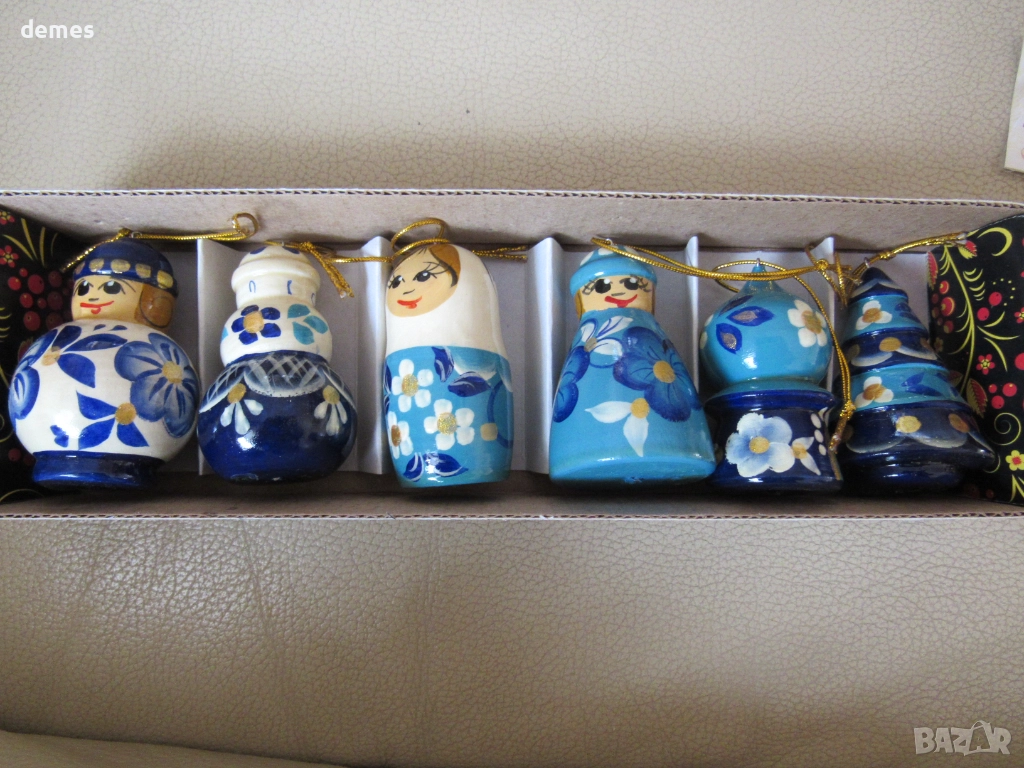 Сетът включва 6 броя елхови играчки-матрьошки.