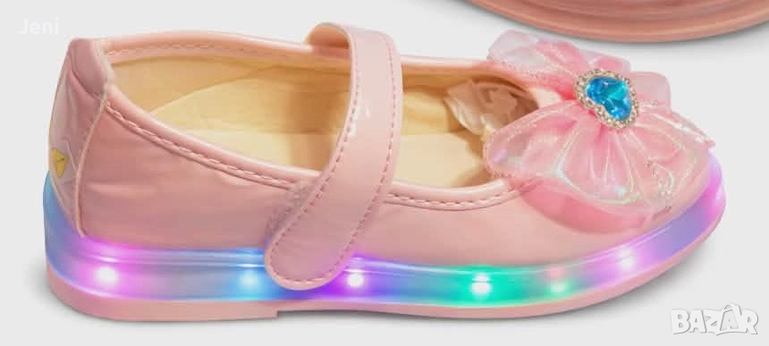 НОВИ! Розови красиви обувки за момиченце, мека кожа, удобни, с панделка, камъче, и светещи подметки.Дължина на стъпалото 18.3см. Само един чифт в момента! Преглед и тест.