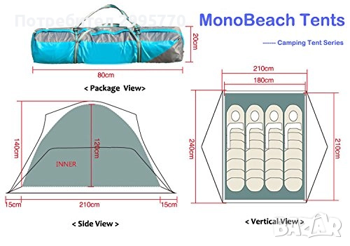 Размер на палатката: 240 x 215x 130 cm