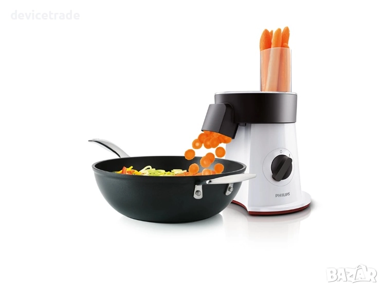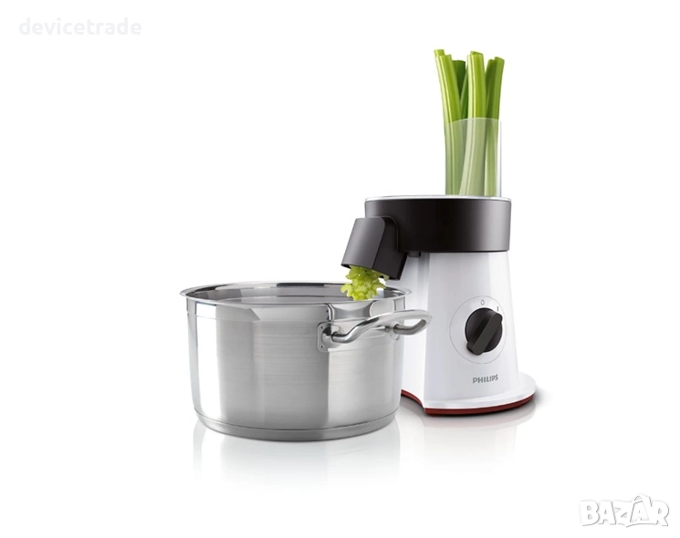 Директно сервиране в купа, съд и уок - с функцията за директно сервиране на уреда за салати от Philips можете да нарежете съставките си директно в избраната купа за салати, тенджера за готвене или тиган за уок. Високият улей позволява използването дори на високи съдове за големи количества. Това означава, че ще имате много по-малко за почистване след приготвянето на храната.