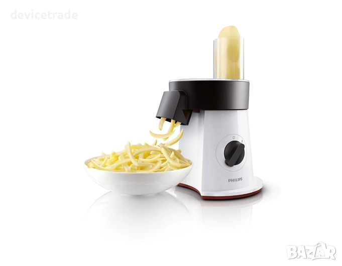 Изцяло метален XL диск за нарязване на ивици за картофи за пържене - с отделния XL диск за нарязване на ивици на уреда за салати Philips можете да нарязвате картофи за пържене, но също да обработвате и други съставки като моркови, тиква, алабаш, тиквички и др. Крайният резултат е идеален за любимите ви пържени зеленчуци.