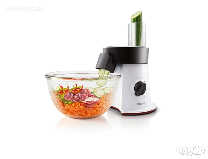 Регулируем S до XL улей за подаване - с регулируемия улей за подаване от S до XL на Philips saladmaker можете да имате оптимален контрол над съставките, които искате да обработите, и да получите желания резултат. Улеят за подаване с размер S е идеален за единични тънки съставки, като например морков. Улеят за подаване с размер XL е подходящ за по-едри продукти, като например картофи и др. , което свежда до минимум необходимостта от предварително нарязване.