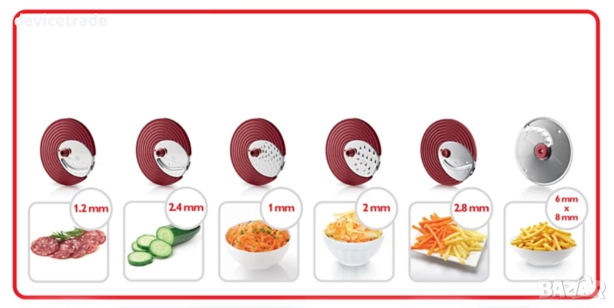 5 вложки за нарязване във всякакви форми и размери - п етте вложки позволяват безкрайно разнообразие в нарязването и настъргването. Просто изберете вложка и я поставете в държача за дискове.