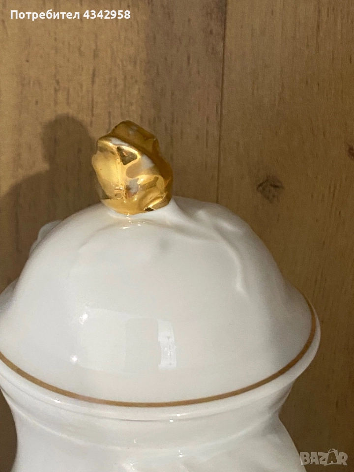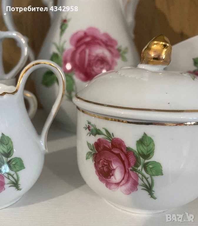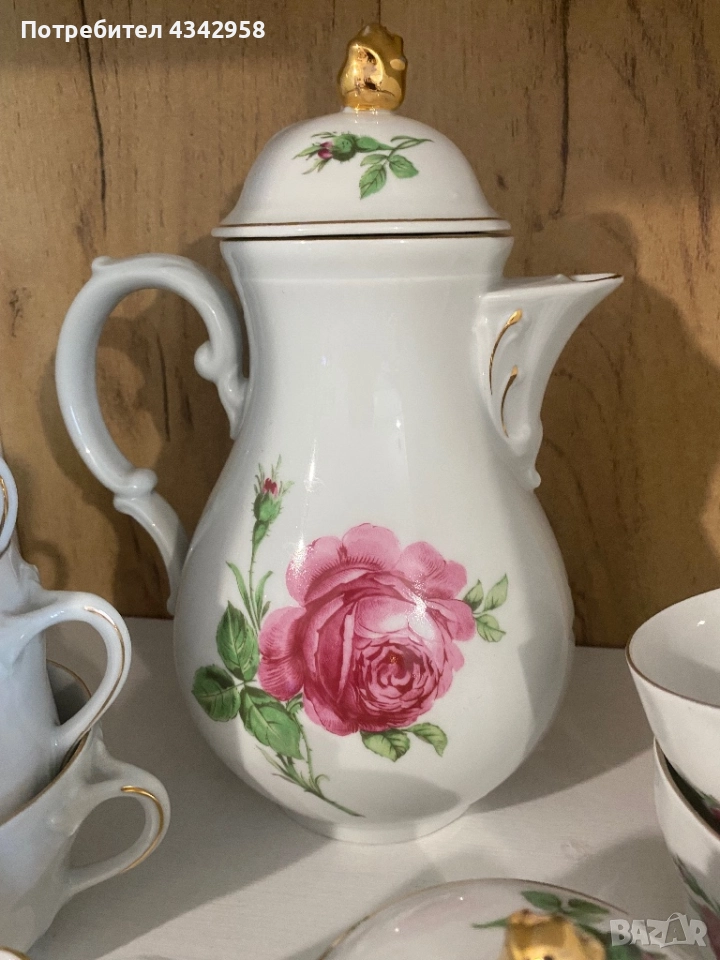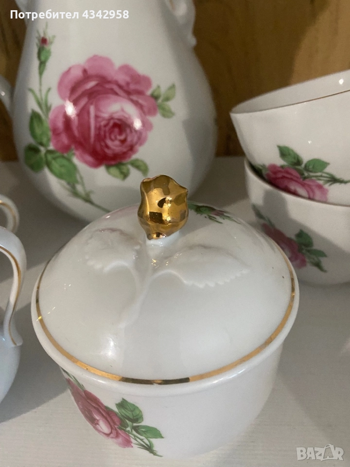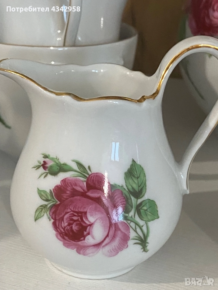Сервизът е изработен от фин баварски порцелан с красив ръчно рисуван декор с рози и златни кантове. Класически и изискан дизайн.