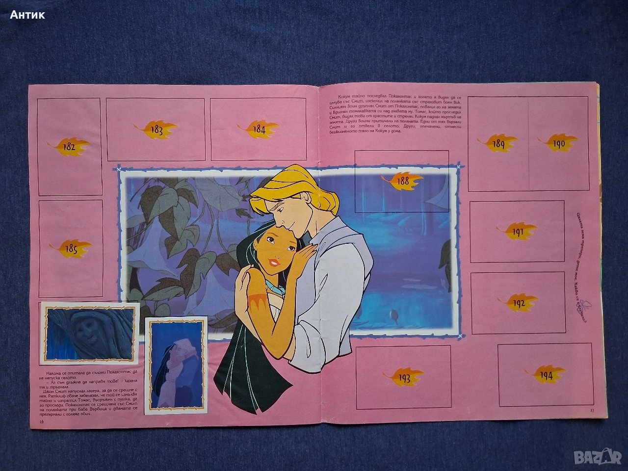 Рядък Албум за Лепенки Panini Покахонтас Егмонт 1996 год. Залепени 50 Броя Летенки На няколко страници има забележка / Отлепени лепенки при което се е получило скъсване / Съобразено е със Цената / Изпращам с Еконт