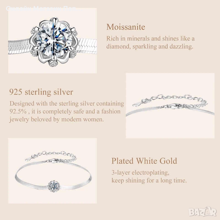 Тази изящна дамска гривна WOSTU е украсена с блестящ 0.5 карата диамант мойсанит, оформен в романтичен дизайн на кръгло цвете. Изработена от висококачествено 925 сребро с покритие от 14к бяло злато, гривната съчетава луксозен външен вид и дълготраен блясък.