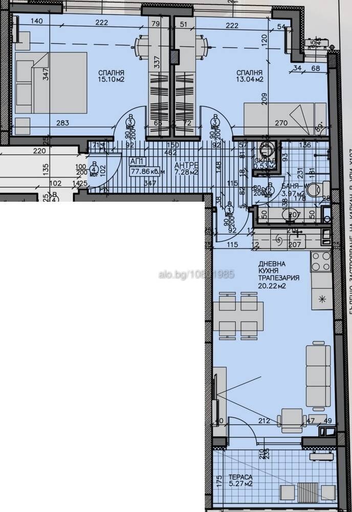 Разпределението на апартамента се състои от: кухня - дневна - трапезария, две спални, баня с WC, склад антре и тераса.