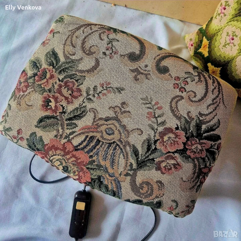 Винтидж отопляема табуретка за крака с тапицерия тип "гоблен" и крачета от масивно дърво. Размерът й е 40х30 см, а височината й е 20 см.
