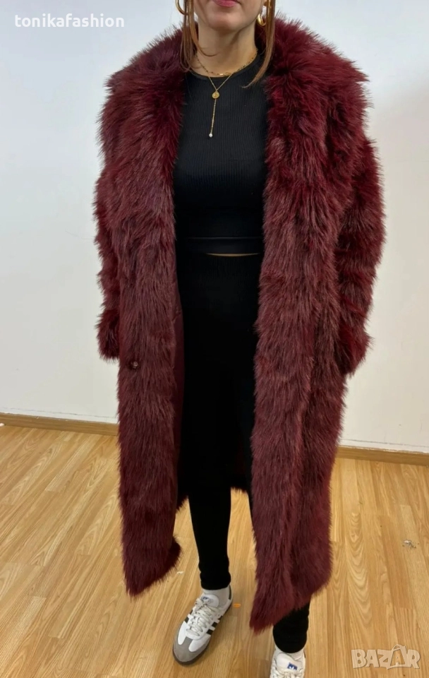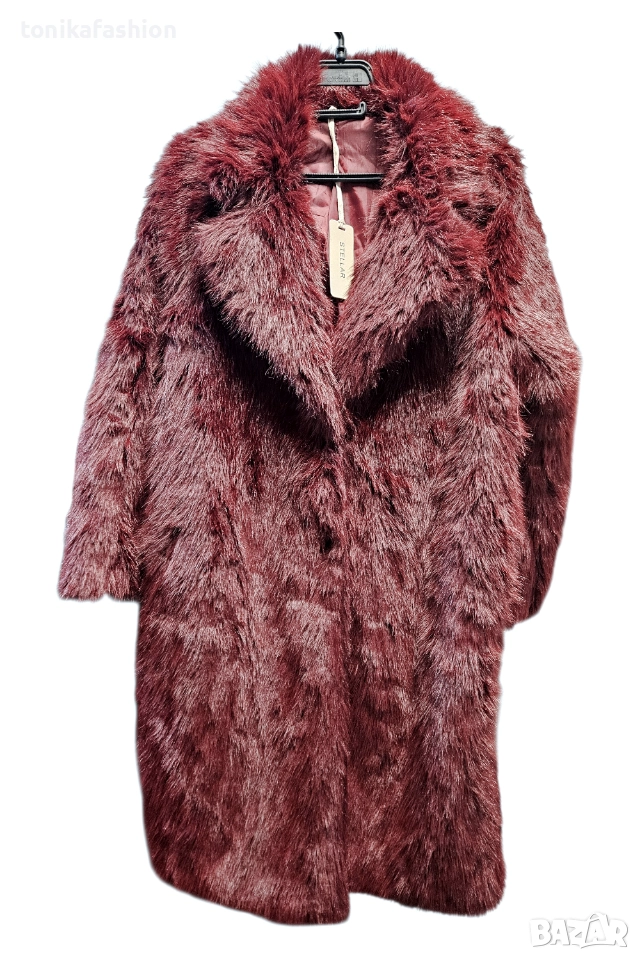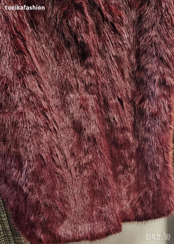 Палто с еко косъм в актуален бордо цвят.Прав модел с голям ревер, джобове в страничните шевове, две секретни скрити копчета. Стандартен размер подходящ за М ,L, XL - до 110см ханш. Дължина 105см.