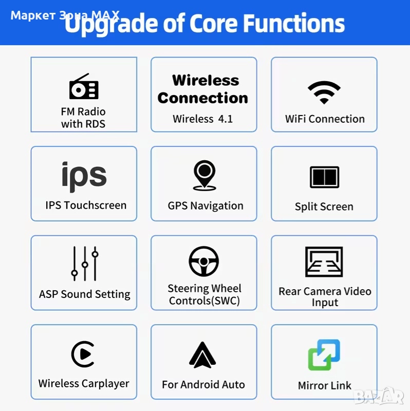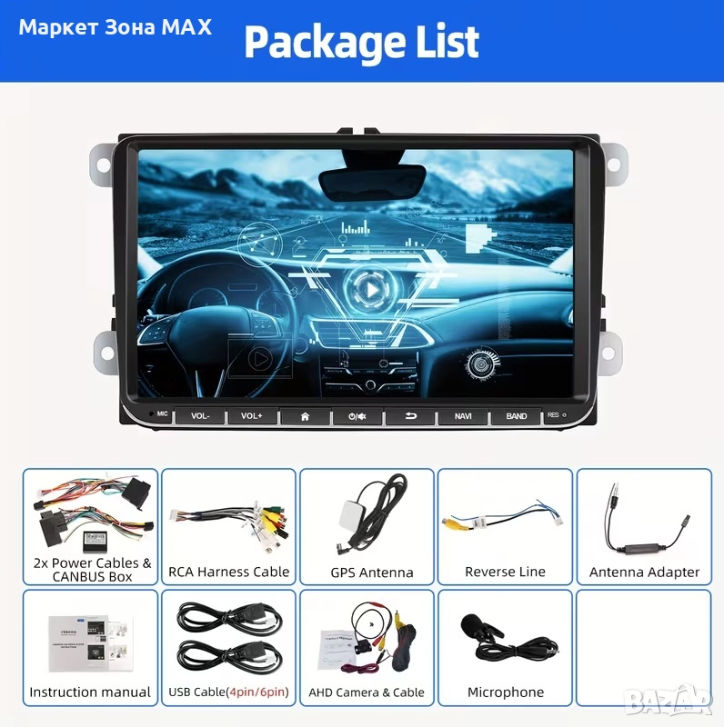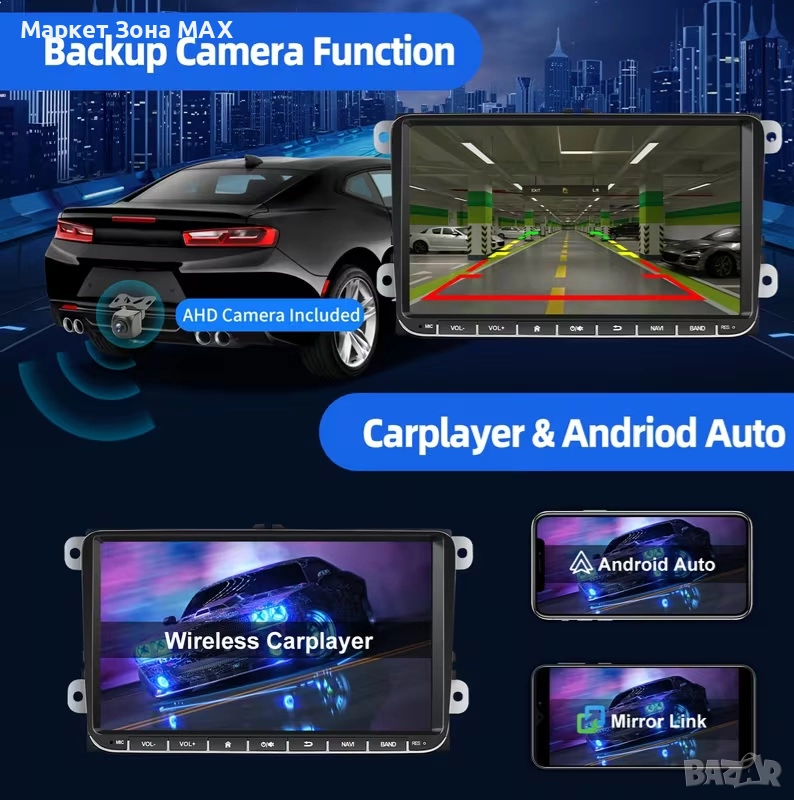 Екран: 9 инча / 22.86 см IPS капацитивен сензорен екран, голям ъгъл на видимост, Mirror Link