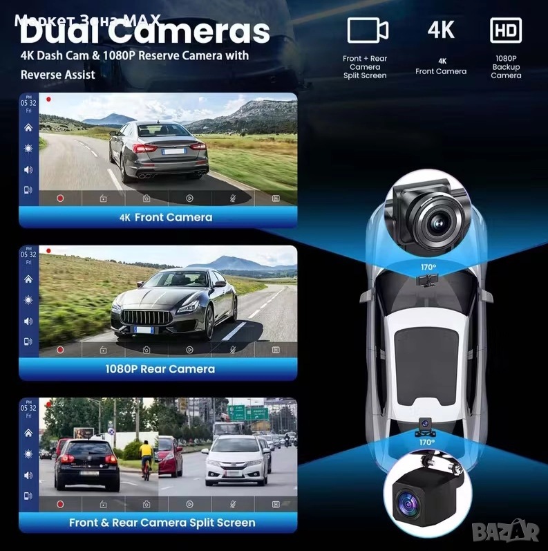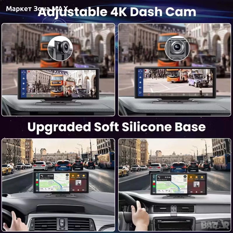 Мултимедия 4К + 1080P камера за кола с IPS тъчскрийн, CarPlay/Android Auto и GPS