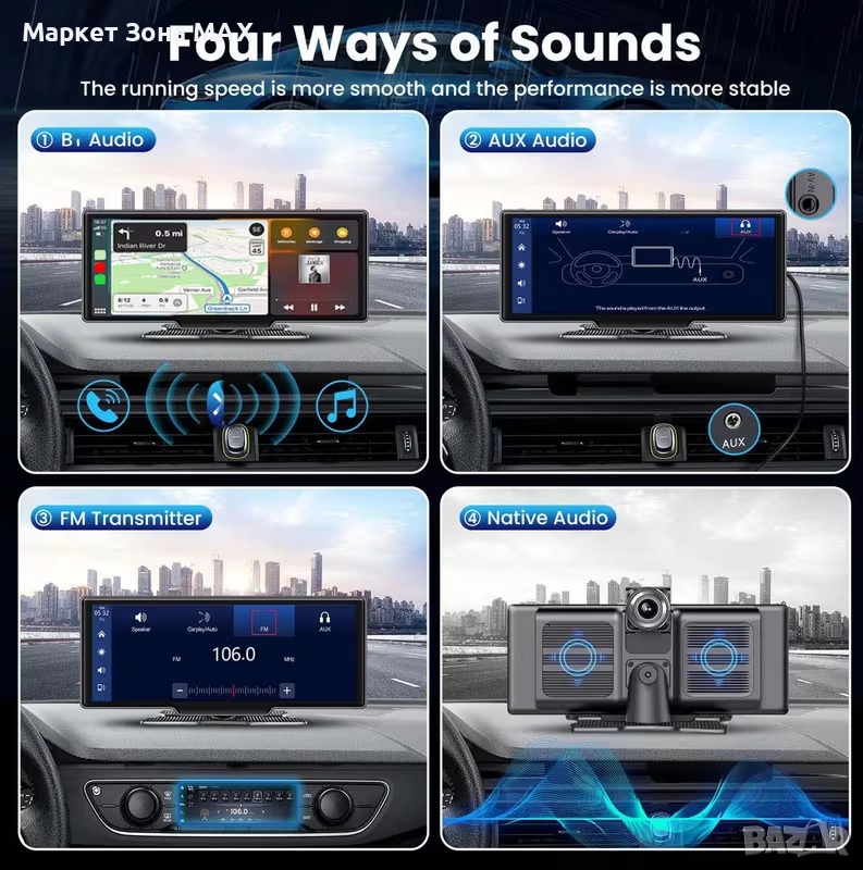 Вградена GPS навигация, управление чрез Siri или Google Assistant.