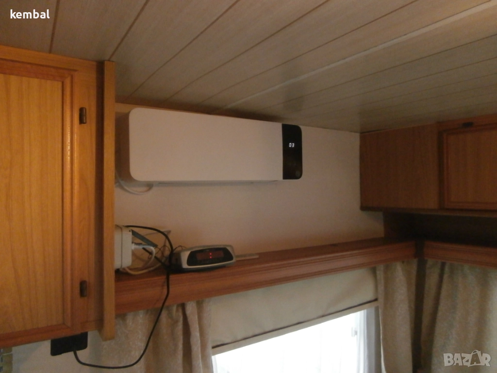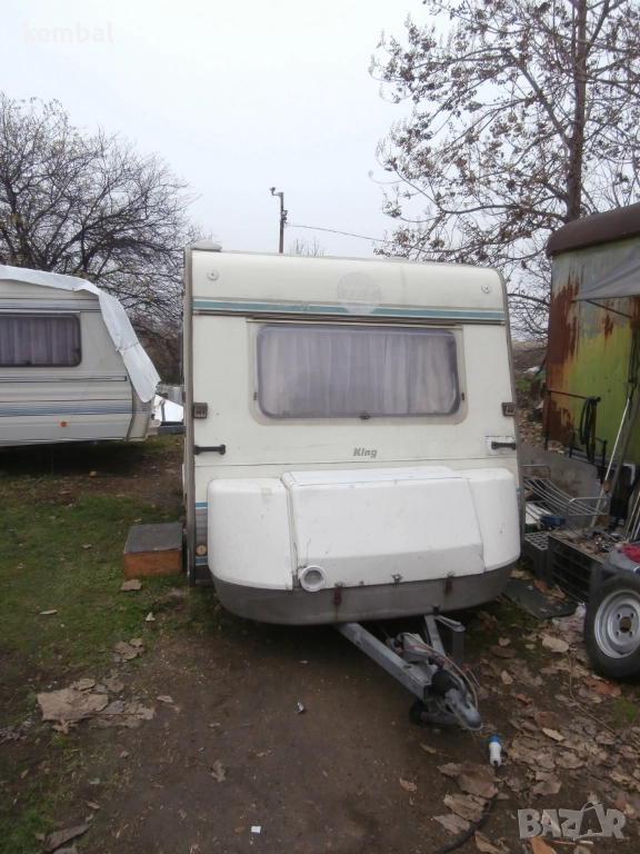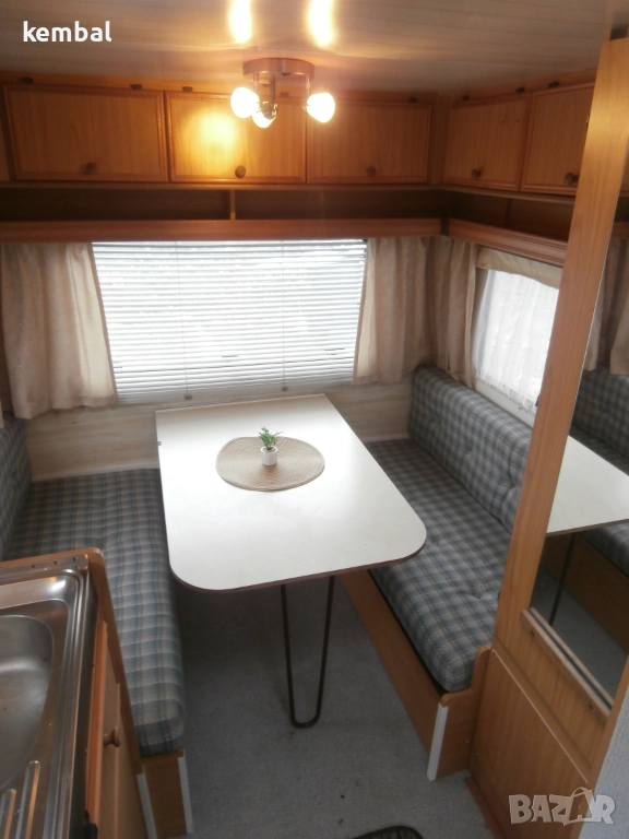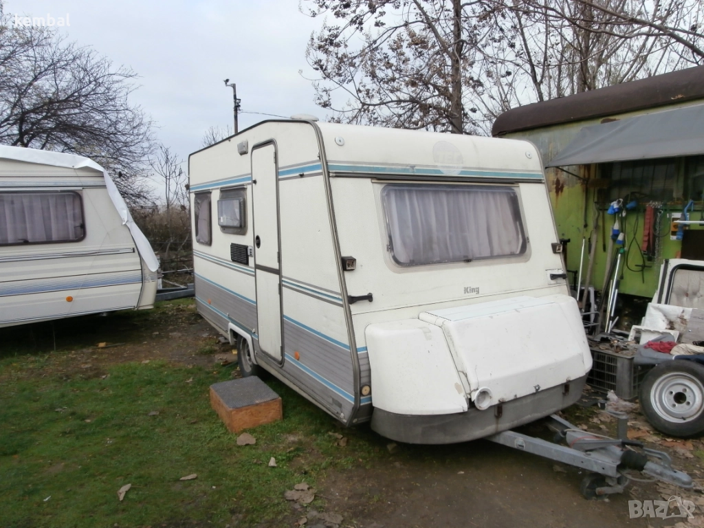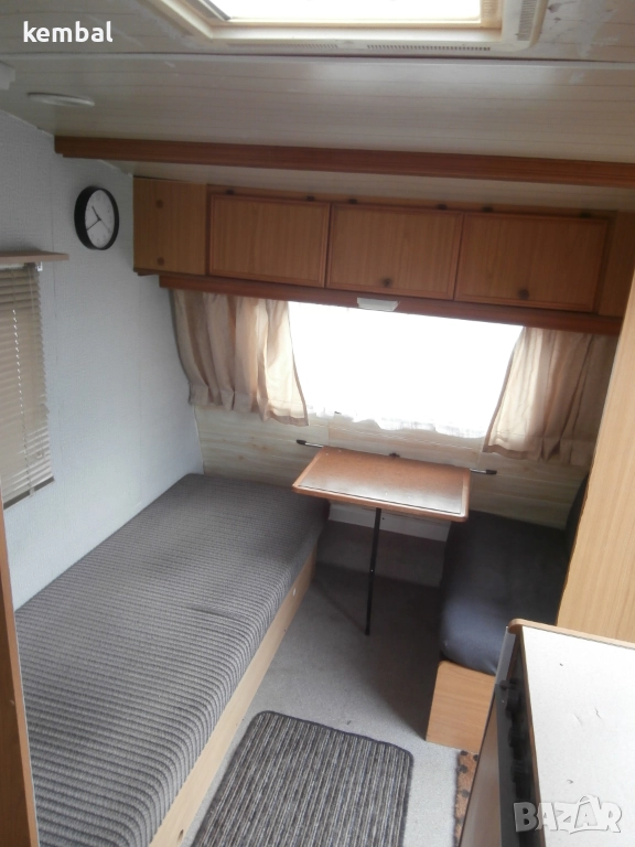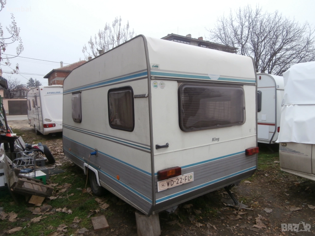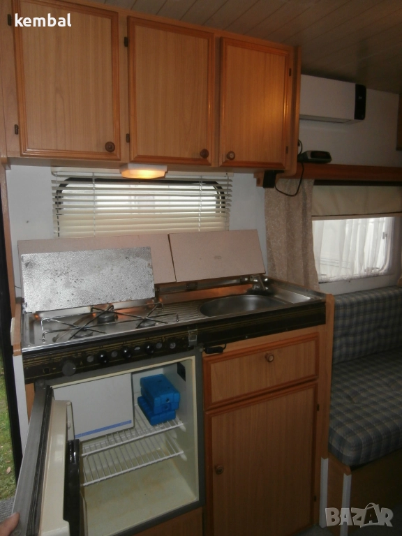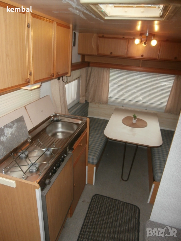 малка каравана нов внос , има две отделни места за спане общо за 3-ма човека,отоплителен уред тип(стенен климатичен конвектор)мивка с помпа за вода,газови котлони, хладилник работещ на газ и ток,караваната има 12 -220в инсталация,няма течове ,вътре е сравнително добре запазена и е готова за ползване