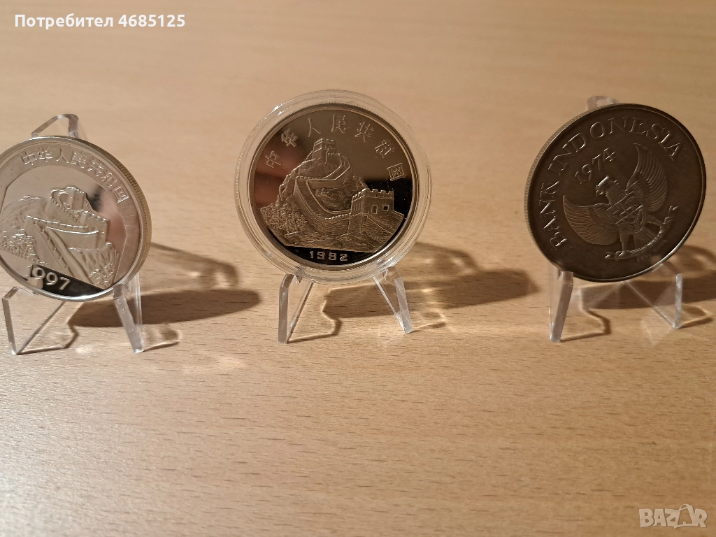 Лот китайски сребърни монети 1992 и 1997 proof, както и сребърна монета от Индонезия 1974г. → Обява 52886346