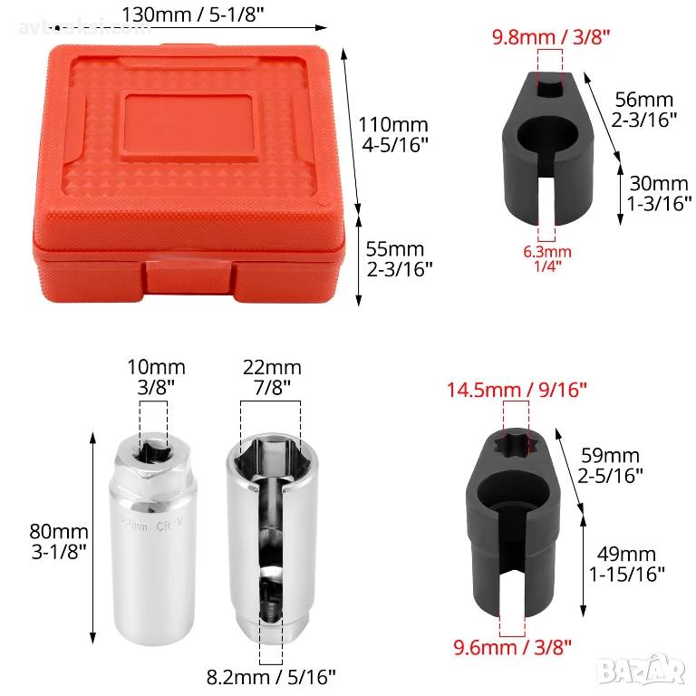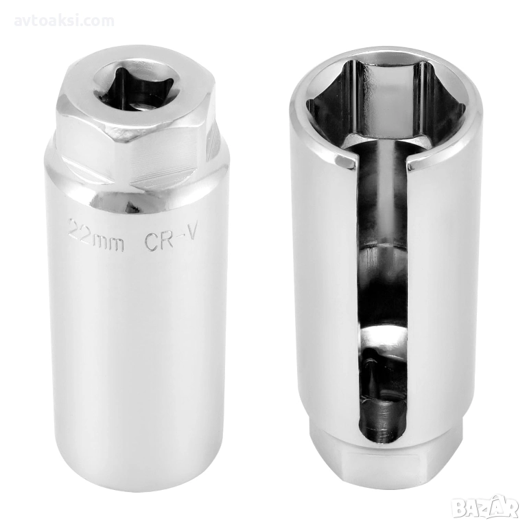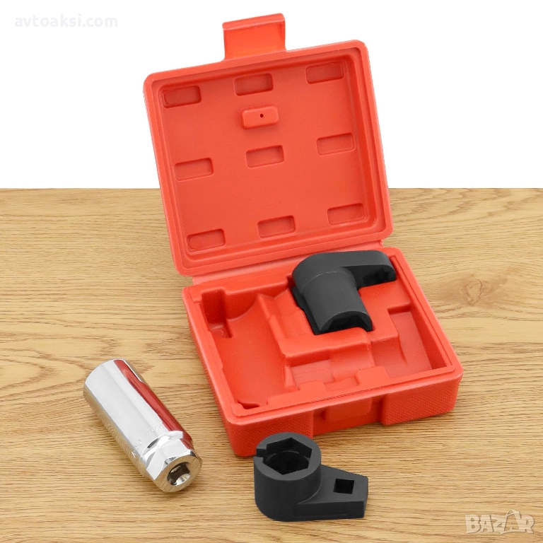 - Универсален вложков ключ 6:7/8" (22 мм) за всички шестоъгълни кислородни сензори, универсални задвижващи краища 3/8" и 1/2" за употреба с тресчотка или пръти.