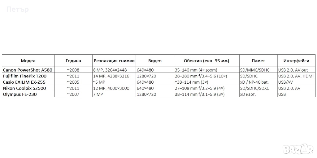 Всички апарати без без зарядни и/или други аксесоари, освен Olympus FE-230, който е в комплект с оригинално зарядно.