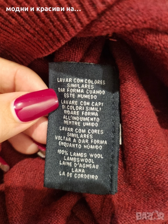 С V- образно деколте. Материята е изцяло агнешка вълна- качествена и топла. С лого на бранда.