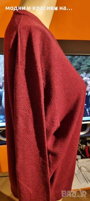 Мъжки пуловер, изработен от качествено, топло плетиво- агнешка вълна. Цветът е прекрасен-наситен дълбок виненочервен цвят с нюанс към бордо.