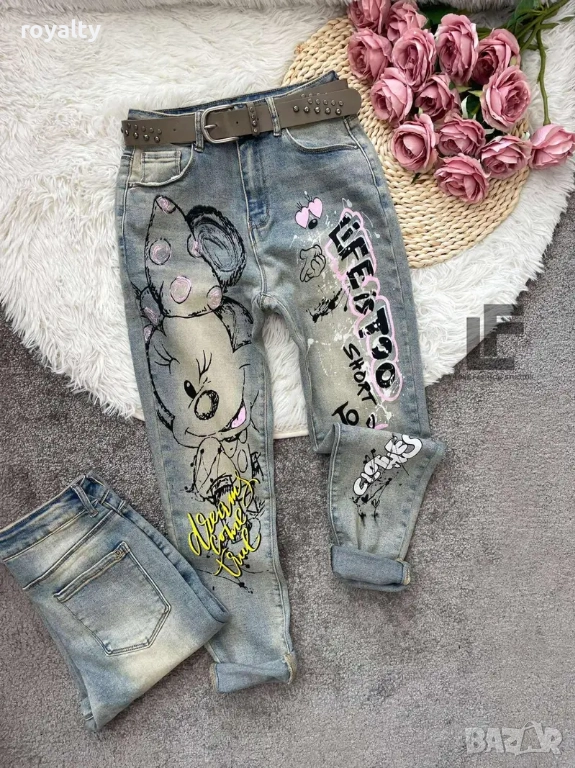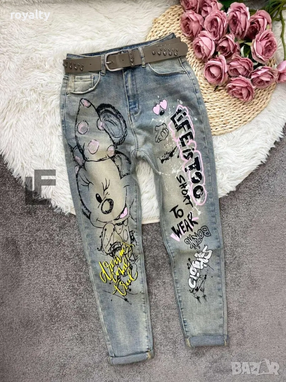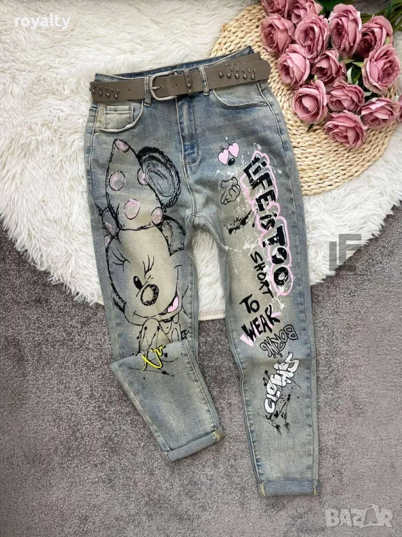 Кройка: Кройката е тип “Mom’s” с висока талия и стесняващи се крачоли, декорирани с любимите ни хенд – мейд рисунки