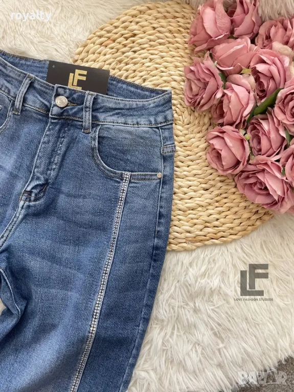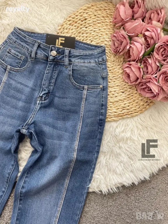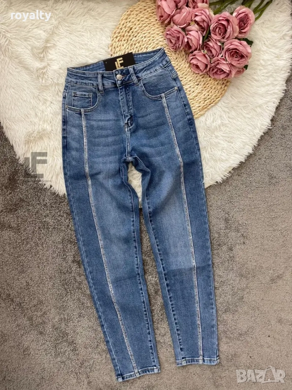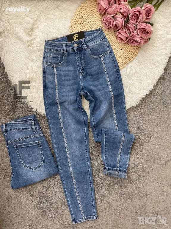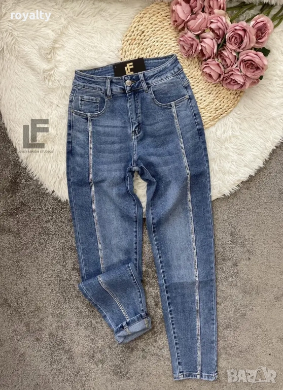 Кройка: Кройката е тип “Mom’s” със средна към висока талия и стесняващи се крачоли, декорирани с камъчета