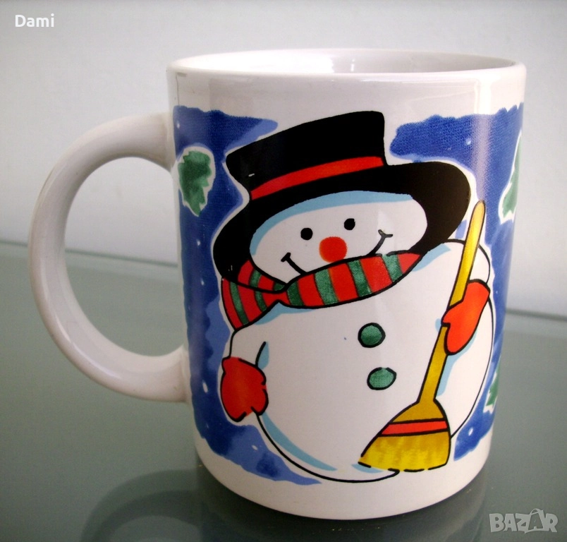 Чаша от бяла керамика с мотив снежен човек по цялата външна повърхност на чашата. Размери: височина 10 см, диаметър 8 см, вместимост 200 мл.