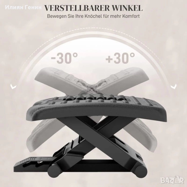 Индивидуално регулируема: Регулирайте ъгъла на наклон на поставката за крака от -30° до +30°, за да облекчите натиска върху глезените си и да увеличите максимално комфорта. Особено полезно за тези, които стоят дълго време или носят високи токчета.