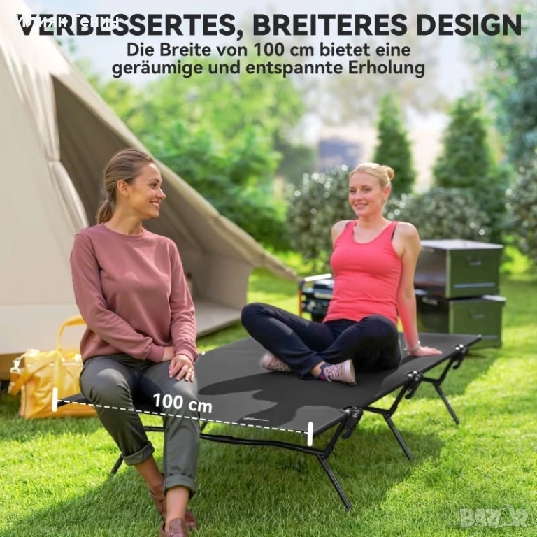 ✔ Дизайнът с ширина 100 см на сгъваемото къмпинг легло осигурява просторна и удобна зона за спане.