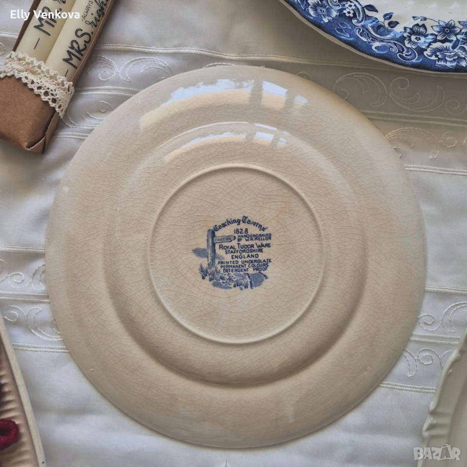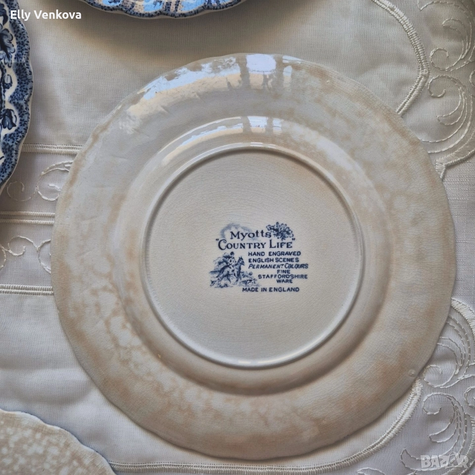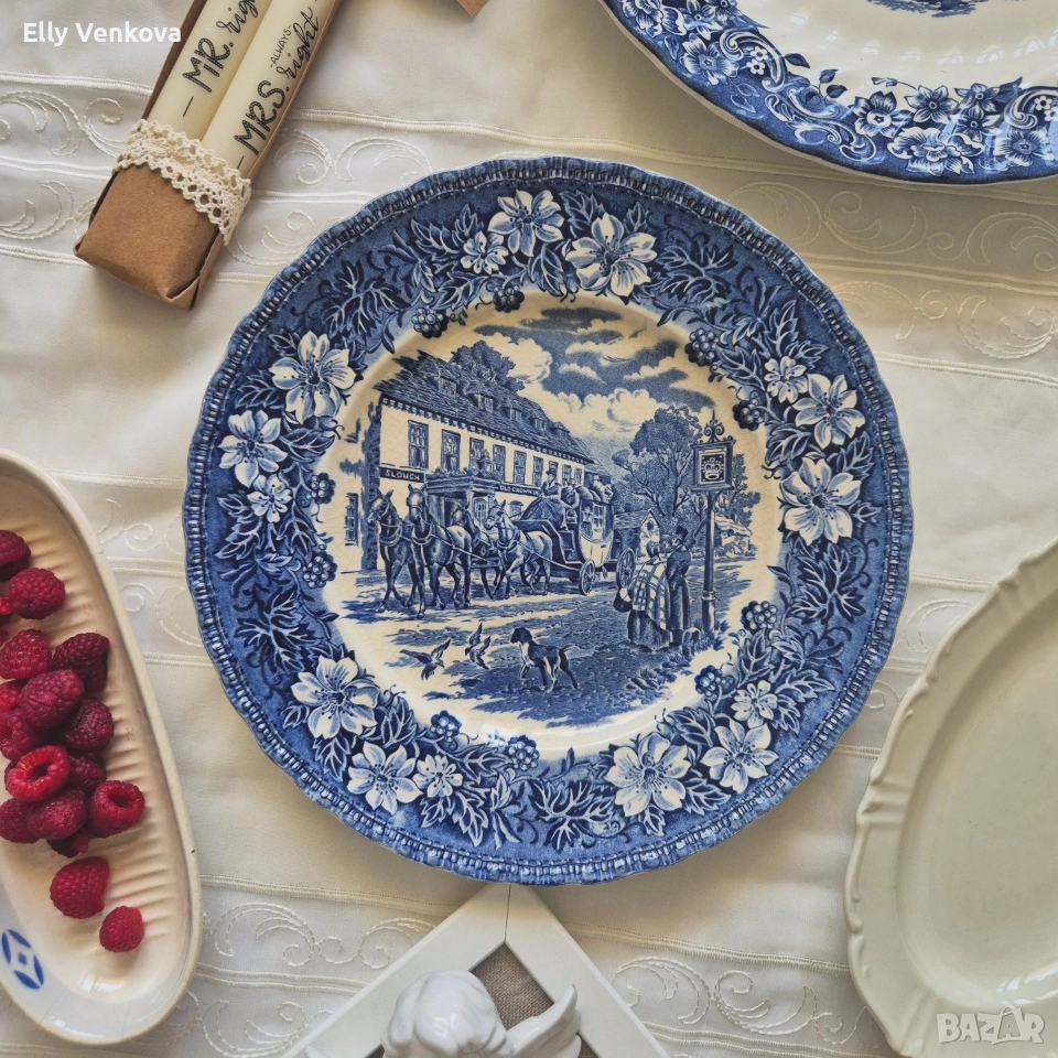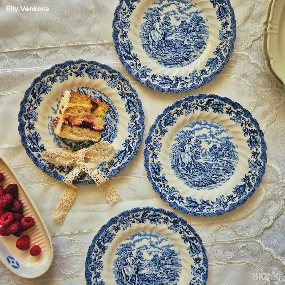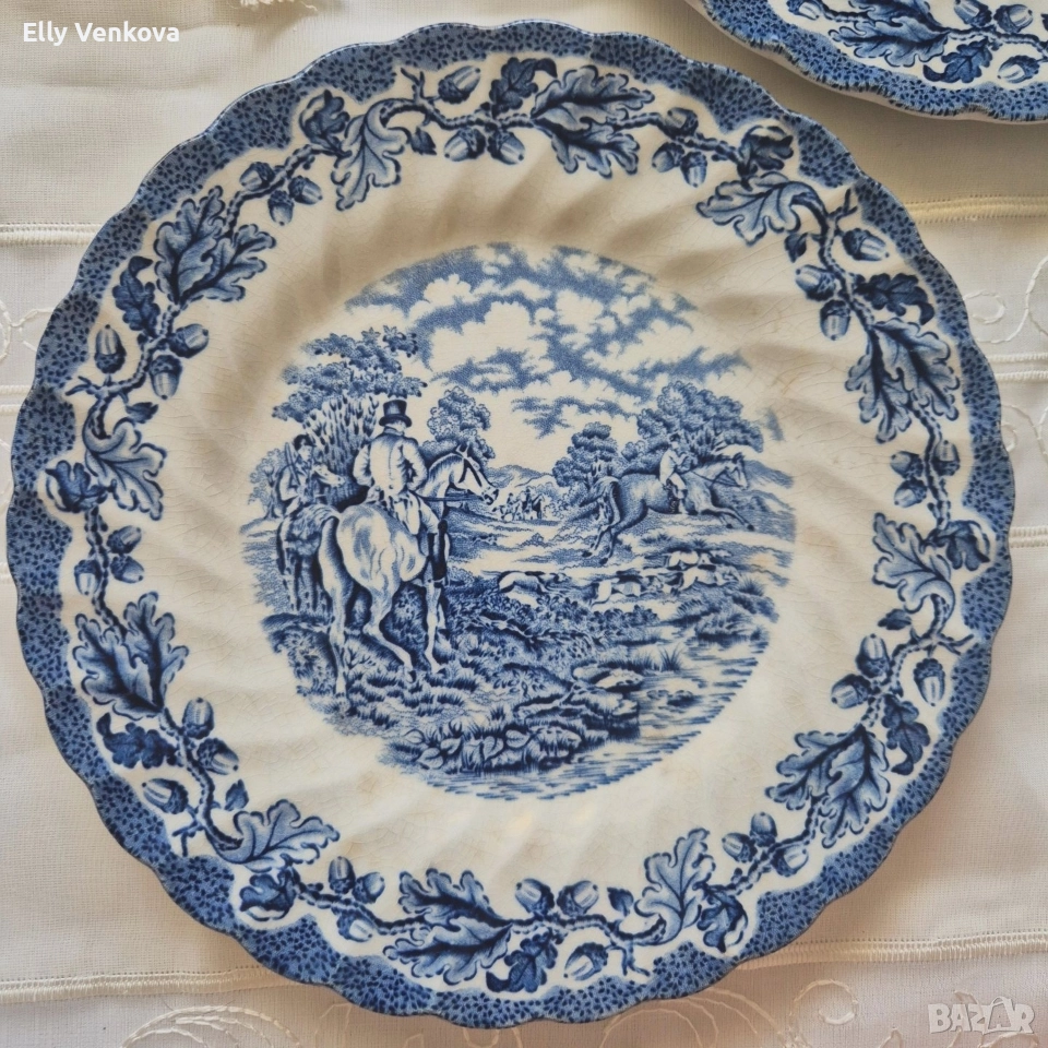 ◇ Четири чинии със син декор Myotts Country life с диаметър 20 см. На места имат потъмняване главно отзад. ⚜️ Цена за брой: 10 лв ◇ Голяма чиния със син декор Royal Tudor Ware "Coaching Taverns" с диаметър 27,5 см. ⚜️ Цена: 29 лв ◇ Кръгло плато със син декор Royal Tudor Ware "17th Century England" с диаметър 34 см. ⚜️ Цена: 55 лв