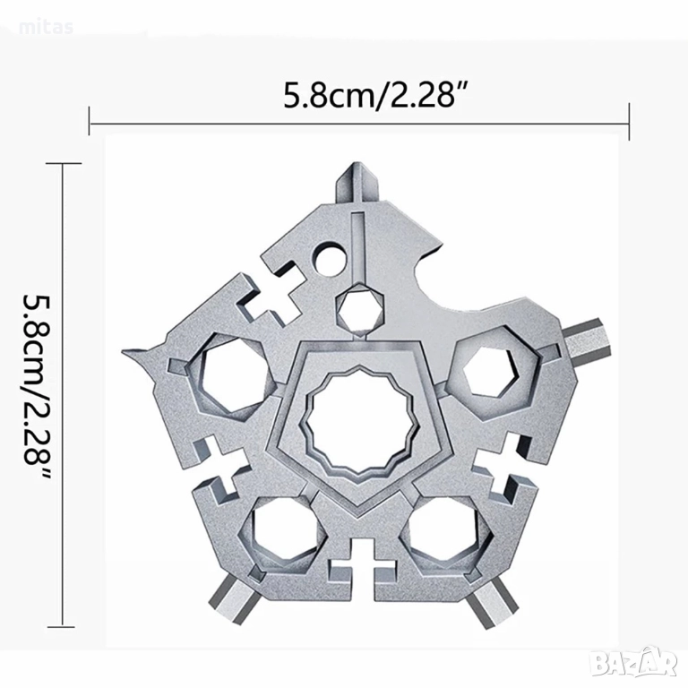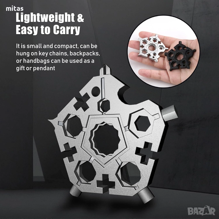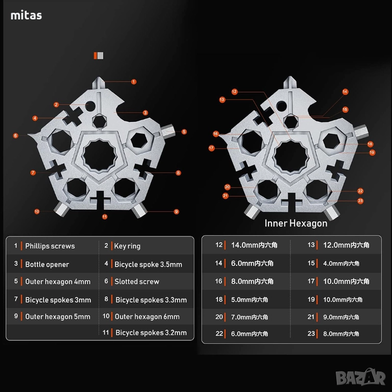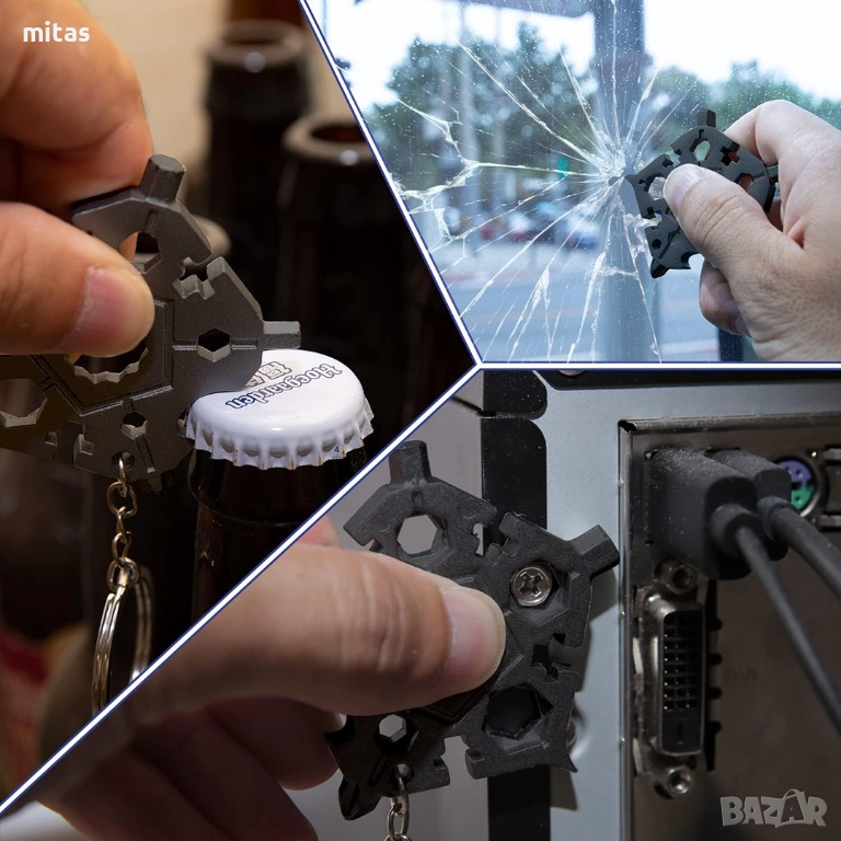 - Брой функции: 23 интегрирани инструмента (отвертки, гаечни ключове, отварачка и др.).