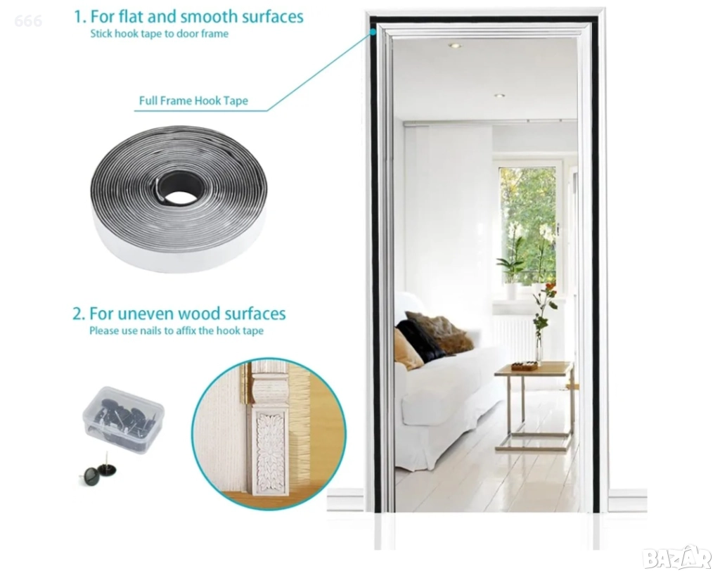 Вратата Apalus Comb е супер лесна за монтаж. Не са необходими винтове, пирони, други инструменти. Залепете предоставената лепяща лента върху рамката на вратата и я поставете върху вратата Comb и е готово! Завесата ще си остане на мястото през цялото лято. Тя е подвижна, преносима и може да се пере. Така че, когато дойде зимата, можете да я свалите и да я приберете за следващата година.