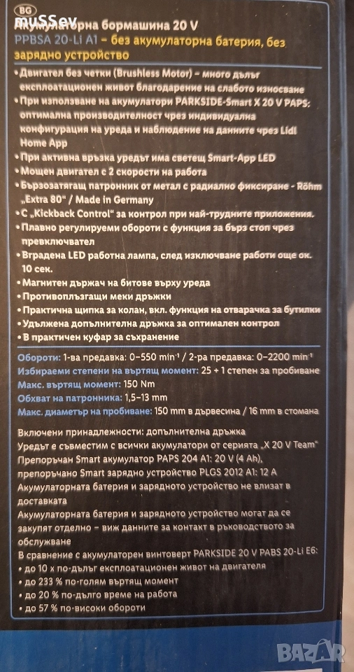 акумулаторна бормашина 150Нм. на Парксайд Parkside Performance 20V PPBSA A1 с гаранция 5г. → Обява 52888660