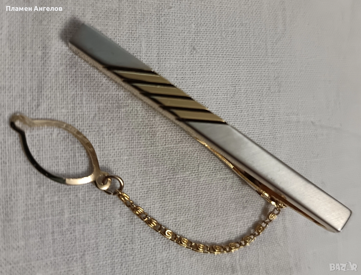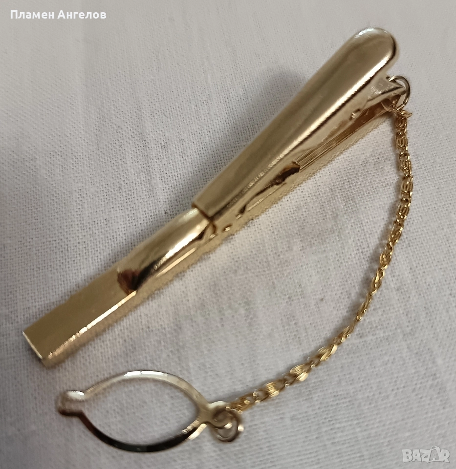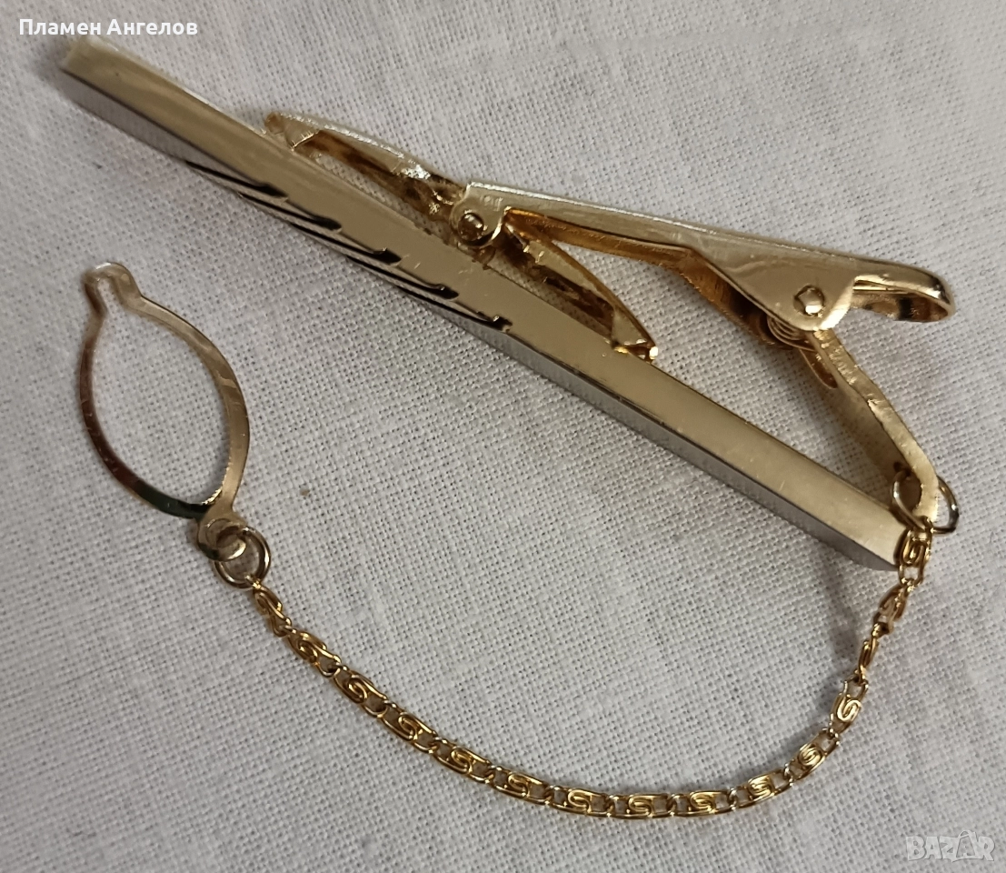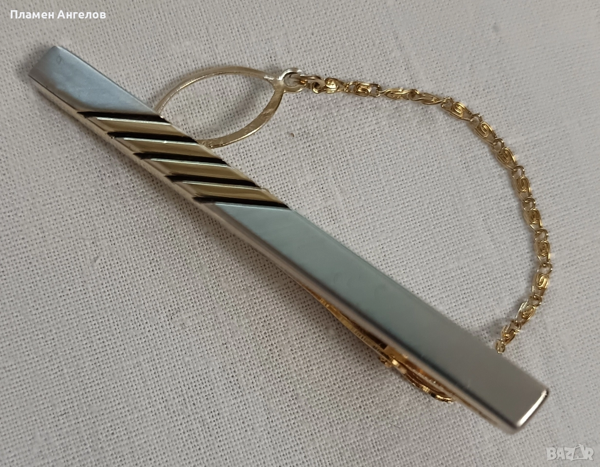 Щипка или игла за вратовръзка. Аксесоар в златист цвят с класически дизаин, с диогонални линии на основната част. Разполага с златиста верижка. Стилна щипка, неопотребявана в отлично състояние нова без забележки.