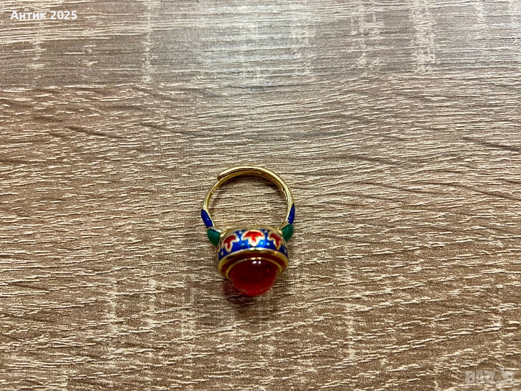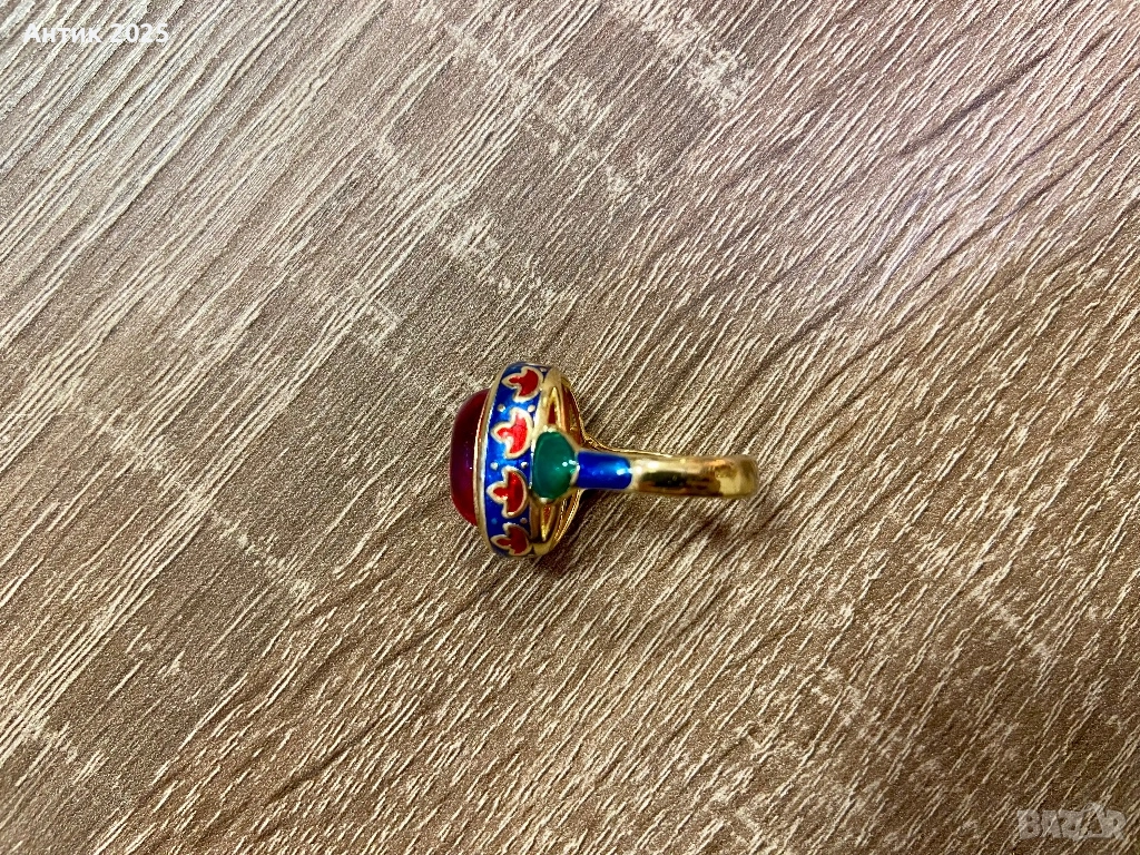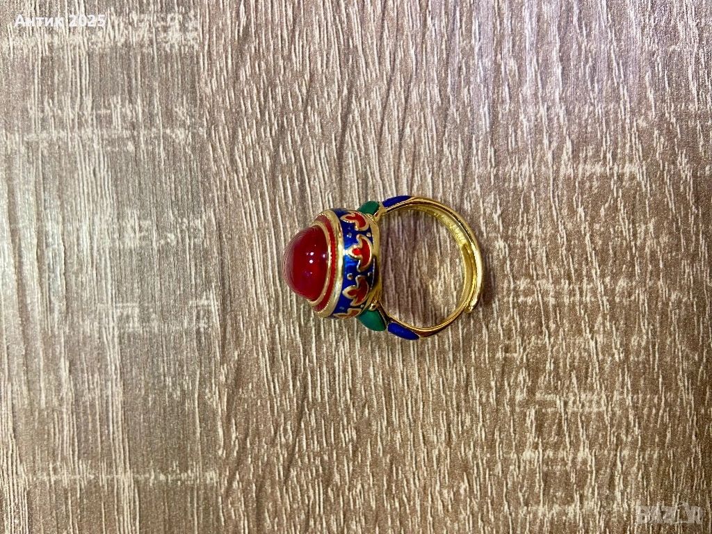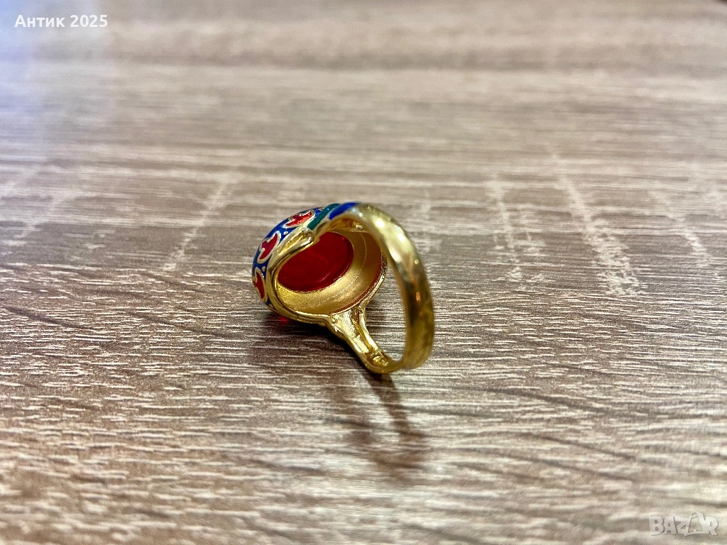 Ефектен декоративен пръстен с голяма овална вложка в наситен червен цвят. Основата е украсена с цветен емайл в сини и зелени нюанси с орнаментални елементи, които придават на бижуто изразен ориенталски характер. Пръстенът е с универсален (регулируем) размер, лесно се наглася и е подходящ за различни пръсти.