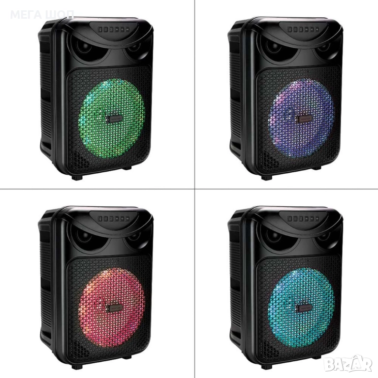 Говорител: 8''; Функции: USB слот, AUX, FM радио, Bluetooth; Цветно осветление: Да; Батерия: 3.7V/1200mA; Честотна характеристика: 55Hz-20kHz; Съпротивление: 3 ohm; Мощност: 7W; Аксесоари: USB кабел, 1 бр. жичен микрофон; Цвят: Черен; Нето тегло: 1.54kg; Бруто тегло: 1.90kg; Размери (ВхШхД): 350x245x200mm; Размери на опаковка (ВхШхД): 362x255x206mm.