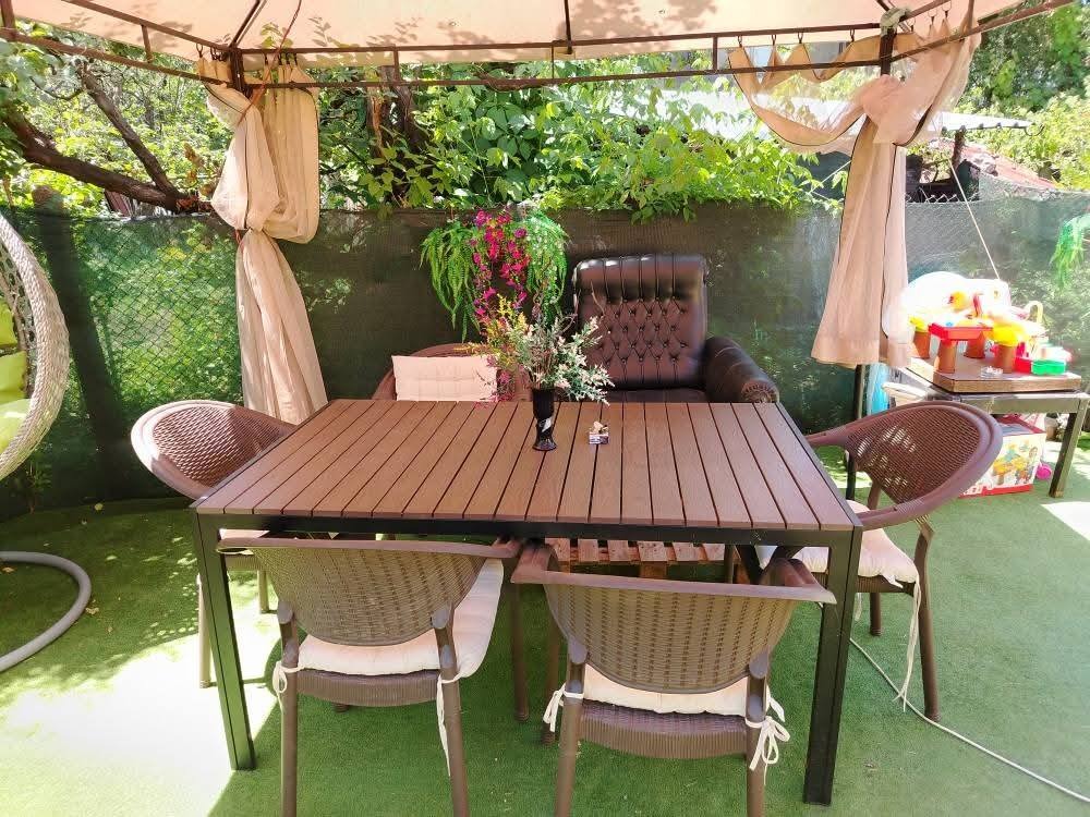 Имотът разполага с двор от 525 кв.м, красиво оформен, с обособен кът за отдих перфектен за летни вечери, барбекю и детски игри. Към къщата има гараж с площ 28 кв.м, както и мазе 30 кв.м и таван 60 кв.м, който позволява изграждане на допълнителни помещения според нуждите ви.Улицата е с нов водопровод и канализация.